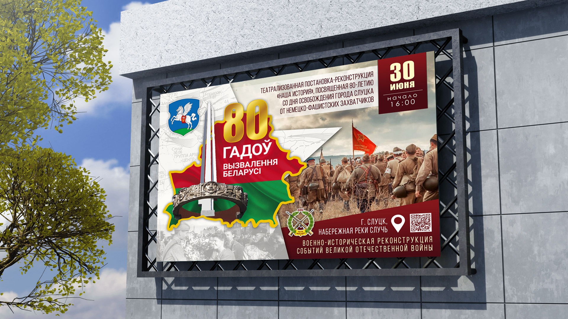 Дизайн баннера и рекламной листовки для театрализованной постановки-реконструкции «Наша история», посвященной 80-летию со дня освобождения города Слуцка от немецко-фашистских захватчиков. Подготовка и верстка для типографской и баннерной печати.